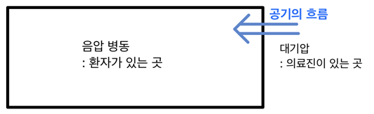 그러니까 양압 → 대기압 → 음압 으로 공기가 흐른다는 것이죠. 공기 중의 바이러스나 세균은 공기의 흐름대로 움직이니까 감염자에게서 유래한 바이러스나 세균이 의료진이나 비감염자에게 노출되지 않도록 하는 조치라는 겁니다.